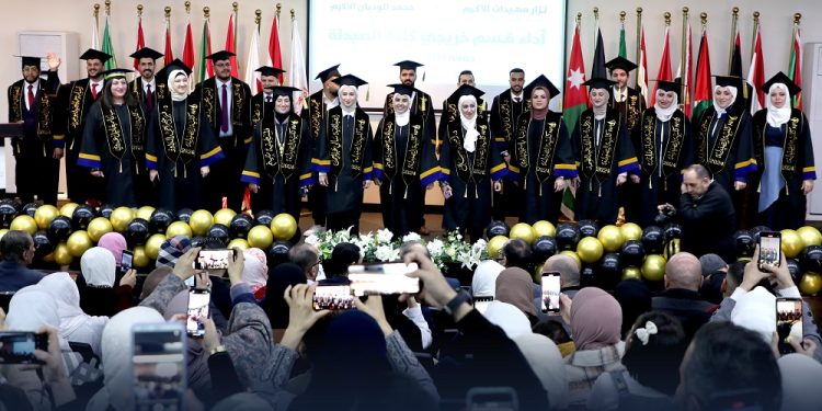 وقدمت الدكتورة أبو حويج عميد كلية الصيدلة كوكبة متميزة من الخريجين والتي تتهيأ لتحمل في قلوبها وضمائرها عهداً أمام الله لرسالة عظيمة لمهنة الصيدلة يحملونها بكل صدق وأمانة وإخلاص، بعد أن عملوا وتفانوا في تحصيل المعرفة وتطوير مهاراتهم العلمية والعملية وتجاوزوا التحديات بتفوق وقوة إرادة ليرسموا أجمل الذكريات في ساحات كلية الصيدلة في جامعتنا الحبيبة “عمان العربية” معربة عن فخرها واعتزازها بما تسلحوا به من علم ومهارات تخصيصية وشخصية، وحثت الخريجين بالسير بعزم وخطى ثابتة على بركة الله فساحات الوطن الحبيب تنتظرهم للعمل والتميز والعطاء والبناء والسماء ما زالت تتسع للمزيد من النجوم، وأكدت على ضرورة أن يتميز الخريجون وأن يكونوا خير سفراء في سوق العمل ليحفروا بحروف من نور اسمائهم في كتاب المجد والتفوق في ميادين الصيدلة.