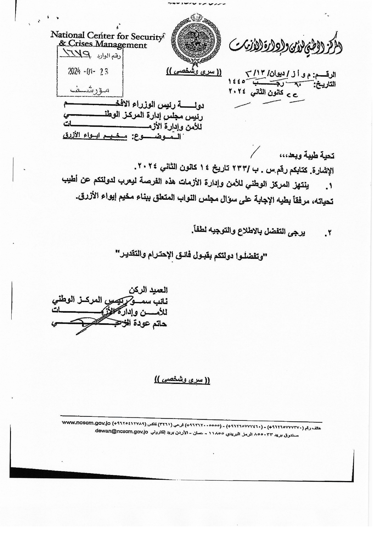 رد المركز الوطني للأمن وإدارة الأزمات، على سؤال نيابي للنائب عدنان مشوقة، بشأن أسباب إقامة مخيم في منطقة الأزرق.
