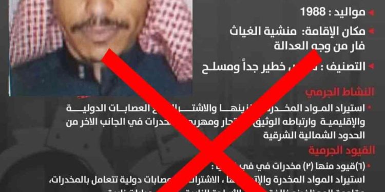 وأكد الناطق الإعلامي أن المطلوب سعود عبيد مخلف الغياث مرتبط بعصابات إقليمية للاتجار بالمخدرات وتهريبها في منطقة منشية الغياث في لواء الرويشد، وهو مصنف بالخطر جداً ومسلّح.