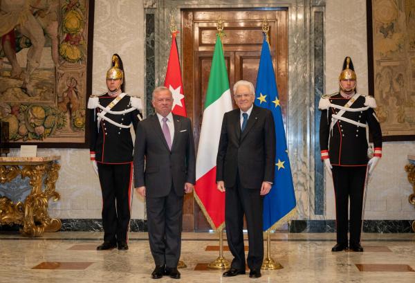 عقد جلالة الملك عبدالله الثاني في روما، اليوم الخميس، لقاء مع الرئيس الإيطالي سيرجيو ماتاريلا بحثا خلاله التطورات بالمنطقة، ولا سيما ما تشهده غزة من أوضاع متدهورة. وأكد جلالة الملك في اللقاء، الذي عقد في القصر الرئاسي، ضرورة التوصل لوقف فوري لإطلاق النار في غزة، ووقف الكارثة الإنسانية في القطاع، وتوفير المساعدات الإغاثية بكل الطرق الممكنة ودون أية عوائق، محذرا من تداعيات الهجوم الإسرائيلي على رفح. وجدد جلالته التأكيد، بحضور سمو الأمير غازي بن محمد كبير مستشاري جلالة الملك للشؤون الدينية والثقافية والمبعوث الشخصي لجلالته، على أنه لا سلام ولا استقرار بالمنطقة دون حل عادل للقضية الفلسطينية، على أساس حل الدولتين، معربا عن تقديره لدور إيطاليا بدعم حل الدولتين. كما بحث الزعيمان العلاقات التاريخية الوطيدة بين البلدين والشعبين الصديقين. وأكد الرئيس ماتاريلا توافق موقف بلاده مع الأردن، خاصة فيما يتعلق بالجهود المبذولة لوقف إطلاق النار في غزة، والتوصل إلى أفق سياسي لتحقيق السلام على أساس حل الدولتين. وأشاد بجهود المملكة في إيصال المساعدات إلى غزة ورفع المعاناة عن أهلها، مؤكدا أهمية الدور الأردني في هذا الوقت الحرج بالمنطقة. وحذر الرئيس الإيطالي من تداعيات الهجوم على رفح وتوسع الصراع الإقليمي. وحضر اللقاء نائب رئيس الوزراء ووزير الخارجية وشؤون المغتربين أيمن الصفدي، ومدير مكتب جلالة الملك، الدكتور جعفر حسان، والسفير الأردني لدى إيطاليا قيس أبو ديه، وعدد من كبار المسؤولين الإيطاليين.