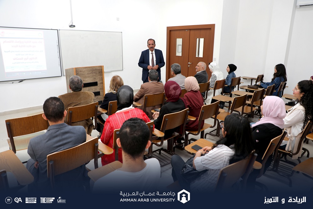 نظّمت كلية الهندسة في جامعة عمان العربية لقاءً مع طلبتها الجدد، وذلك بحضور عميد الكلية الدكتور أنور العساف ورؤساء الأقسام وعدد من أعضاء الهيئة التدريسية والادارية في الكلية.