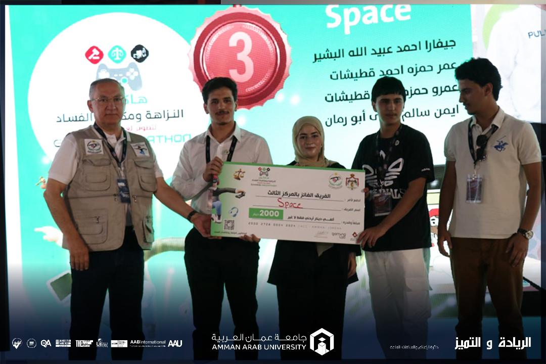 ضمن سعي مركز الإبداع والابتكار وريادة الأعمال في جامعة عمان العربية على تشبيك الطلبة بمسابقات ومشاركات بكافة التخصصات وبكافة الجهات وحثهم على المشاركة في مثل هذه المسابقات وبالتعاون الدائم مع كلية العلوم الحاسوبية والمعلوماتية في الجامعة، فاز الطالب عمرو حمزة قطيشات من كلية العلوم الحاسوبية والمعلوماتية في جامعة عمان العربية / تخصص علم البيانات والذكاء الاصطناعي أحد أعضاء فريق (Space) بجائزة المركز الثالث بمسابقة هاكاثون النزاهة ومكافحة الفساد وقيمتها (2000) دينار أردني عن اللعبة الإلكترونية (Pass or Pass).