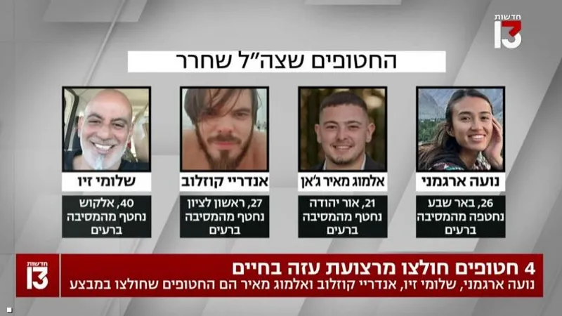 وفي إعلان مشترك للناطقين باسم جيش الاحتلال والشاباك والشرطة، فإنه سمح بنشر تفاصيل عملية وصفت بالمعقدة، جرى خلالها تحرير أربعة محتجزين إسرائيليين السبت، وهم: نوعا أرغاماني (25 عاما)، وألموغ مئير (21 عاما)، وأندريه كوزلوف (27 عاما)، وشلومي زيف (40 عاما). وجميعهم جرى أسرهم خلال هجوم السابع من تشرين الأول/ أكتوبر الماضي.