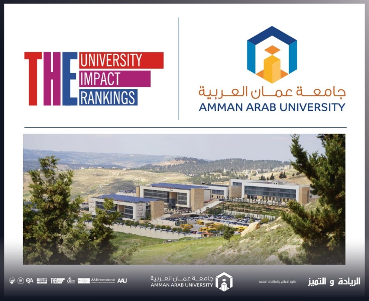صنفت جامعة عمان العربية بالمرتبة الثالثة على الجامعات الأردنية الحكومية والخاصة وبالمرتبة الأربعين عربياً وضمن الفئة 401-600 في تصنيف التايمز لتأثير الجامعات THE Impact Rankings 2024 محققة تقدماً مقداره 400 مرتبة والذي تم خلاله تصنيف أكثر من 2000 جامعة عالمية بزيادة مقدارها 25% عن العام الماضي وبواقع تقدم عن 400 جامعة.