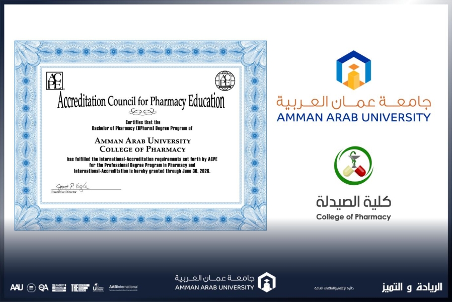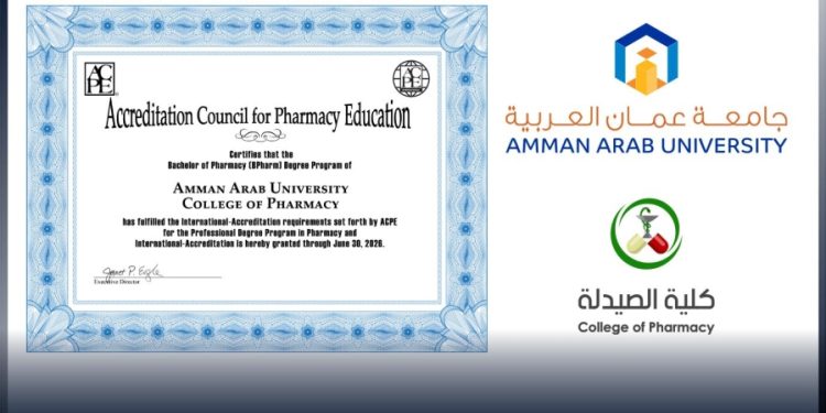 حصلت كلية الصيدلة في جامعة عمان العربية على الاعتماد الدولي من مجلس الاعتماد الأمريكي للتعليم الصيدلاني (American Council for Pharmacy Education – ACPE)، كأول كلية فتية على مستوى الجامعات الخاصة، بعد أن استوفت كلية الصيدلة كامل المتطلبات والمعايير الدولية اللازمة للحصول على هذه الاعتمادية التي تعد اعترافاً دولياً يعكس التزام الكلية بمعايير الجودة العالمية في التعليم الصيدلاني.