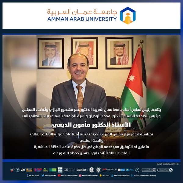 يتقدم رئيس مجلس أمناء جامعة عمان العربية الدكتور عمر مشهور الجازي وأعضـاء المجلس ورئيس الجامعة الأستاذ الدكتور محمد الوديان وأسرة الجامعة بأسمـى آيات التهاني الى