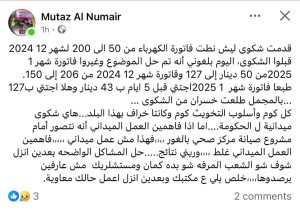 قدم المواطن معتز النمير شكوى رسمية بعد تفاجئه بارتفاع قيمة فاتورة الكهرباء الخاصة به من 50 دينارا إلى 200 دينار لشهر 12 للعام 2024. ونشر النمير على فيسبوك أنه تم قبول الشكوى وإبلاغه اليوم بحل المشكلة حيث تم تعديل فاتورة لشهر 12 عام 2024 من 206 دنانير إلى 150 دينار بينما ارتفعت فاتورة شهر 1 لعام 2025 من 50 دينار إلى 127 دينار وأن فاتورة شهر 1 وصلت إليه قبل خمسة أيام بقيمة 43 دينار إلا أنه فوجئ بارتفاعها إلى 127 دينار بعد معالجة الشكوى مشيرا إلى أنه يشعر بالخسارة بعد تقديم الشكوى بدلا من الاستفادة منها. وأكد النمير أن العمل الميداني لا يقتصر على التصوير أمام مشاريع صيانة المرافق العامة بل يتطلب حلولا حقيقية للمشكلات الواضحة التي تواجه المواطنين