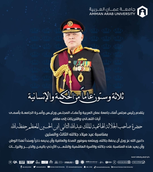 يتقدم رئيس مجلس أمناء جامعة عمان العربية وأعضـاء المجلـس ورئيـس وأسـرة الجامعـة بأسمـى آيات التهـاني والتبريكات إلى مقام