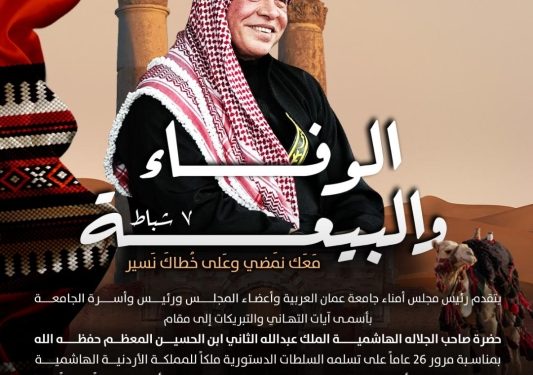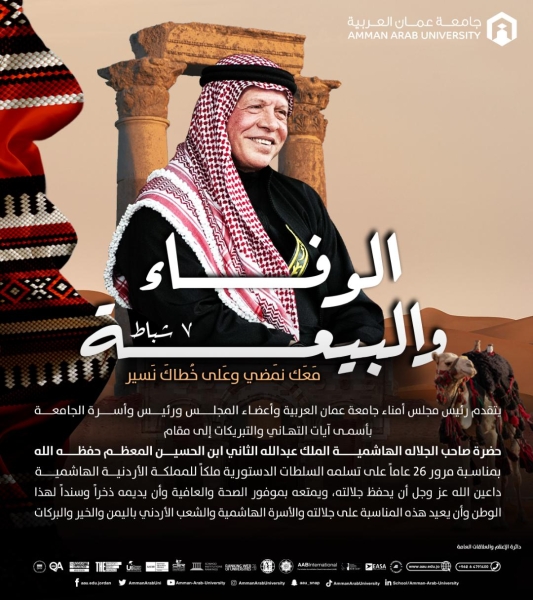 يتقدم رئيس مجلس أمناء جامعة عمان العربية وأعضـاء المجلـــــس ورئيــــس وأســـــرة الجامعــــة بأسمـى آيات التهـاني والتبريكات إلى مقام
