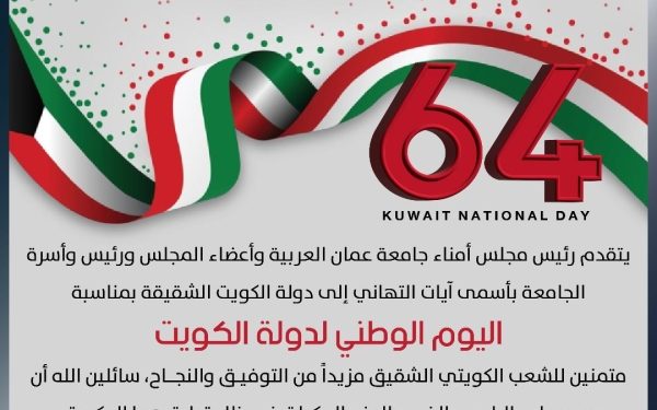 يتقدم رئيس مجلس أمناء جامعة عمان العربية وأعضاء المجلس ورئيس وأسرة الجامعة بأسمى آيات التهاني إلى دولة الكويت الشقيقة بمناسبة