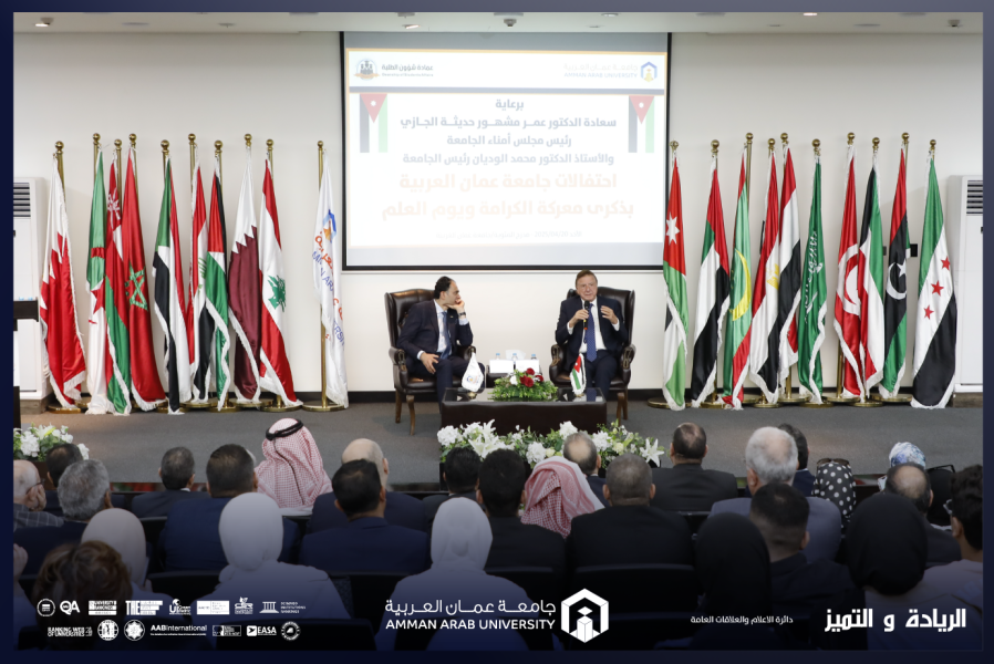 برعاية الدكتور عمر مشهور الجازي رئيس مجلس أمناء جامعة عمان العربية ، احتفلت أسرة جامعة عمان العربية بذكرى معركة الكرامة الخالدة ويوم العلم الأردني، في أجواء وطنية مفعمة بالفخر والاعتزاز مجددة العهد والولاء للوطن وقيادته ومؤكدةً أن المناسبتين تشكلان رمزين عظيمين للعزة الوطنية والكرامة والهوية، وبحضور كلّ من : الأستاذ الدكتور محمد الوديان رئيس جامعة عمان العربية، والدكتور غازي الربابعة الخبير العسكري والاستراتيجي، والأستاذ الدكتور إسماعيل يامين مساعد رئيس الجامعة للشؤون الأكاديمية، والسيدة نادية القديمات مساعد الرئيس للشؤون المالية والإدارية، والدكتور حسام الحمد مساعد الرئيس للتخطيط وضمان الجودة، والدكتور محمد بن طريف عميد شؤون الطلبة، إلى جانب عمداء الكليات، وأعضاء الهيئتين التدريسية والإدارية، وجمع غفير من طلبة الجامعة الذين شاركوا بهذه المناسبة الوطنية الخالدة.