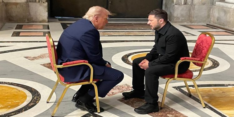زيلينسكي كتب عبر منصة (تليغرام)، أن اجتماعه مع ترامب على هامش جنازة البابا فرنسيس ربما يصبح تاريخيا إذا أفضى إلى انتهاء الحرب بين أوكرانيا وروسيا.