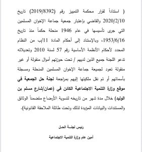 دعت لجنة حل جمعية جماعة الإخوان المسلمين جميع الأفراد الذين بحوزتهم أموال منقولة أو غير منقولة تعود للجمعية المنحلة، إلى مراجعة اللجنة خلال شهر من تاريخه لتسوية أوضاعهم، وذلك استنادًا إلى قرار محكمة التمييز الأردنية رقم (2019/8392) الصادر بتاريخ 10 شباط 2020، والذي قضى بـاعتبار جمعية جماعة الإخوان المسلمين التي تأسست عام 1946 منحلة حكماً منذ تاريخ 16 حزيران 1953. وأكدت اللجنة، في إعلان رسمي صدر اليوم الأربعاء، أن هذه الدعوة تستند أيضًا إلى أحكام المادة 11/ب من النظام المحدد لأحكام الأنظمة الأساسية رقم 57 لسنة 2010 وتعديلاته، والتي تنص على الإجراءات الواجب اتباعها في حال حل الجمعيات أو فقدانها للشخصية الاعتبارية. وطالبت اللجنة كل من بحوزته ممتلكات عائدة للجمعية المنحلة – سواء كانت مسجلة بأسمائهم أو تم نقل ملكيتها إليهم لاحقًا – مراجعة مقر وزارة التنمية الاجتماعية/ لجنة حل الجمعية، الكائن في عمّان – شارع مسلم بن الوليد، مصطحبين معهم كافة الوثائق والمستندات والبيانات المؤيدة لذلك، وذلك خلال مدة لا تتجاوز 30 يومًا من تاريخ الإعلان، تحت طائلة المساءلة والملاحقة القانونية.