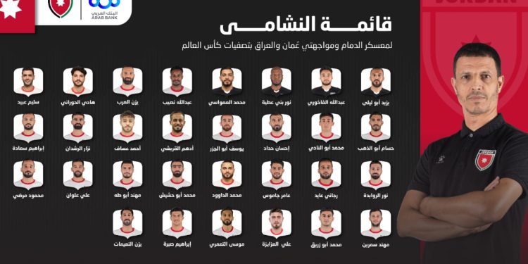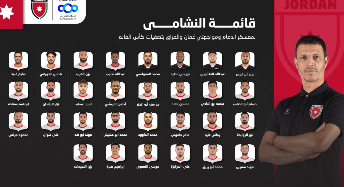 اختار المدير الفني للمنتخب الوطني لكرة القدم، المدرب المغربي جمال سلامي، قائمة ضمت 30 لاعبًا، استعدادًا لمباراتي عُمان والعراق، ضمن الدور الثالث والحاسم من تصفيات كأس العالم 2026. وضمت القائمة: يزيد أبو ليلى، عبدالله الفاخوري، نور بني عطية، محمد العمواسي، عبدالله نصيب، يوسف أبو الجزر، يزن العرب، هادي الحوراني، سليم عبيد، حسام أبو الذهب، محمد أبو النادي، إحسان حداد، أدهم القريشي، أحمد عساف، نزار الرشدان، إبراهيم سعادة، نور الروابدة، رجائي عايد، عامر جاموس، محمد الداوود، محمد أبو حشيش، مهند أبو طه، علي علوان، محمود مرضي، مهند سمرين، محمد أبو زريق، علي العزايزة، موسى التعمري، إبراهيم صبرة، يزن النعيمات. وكان منتخب النشامى، اختتم امس معسكره الداخلي الذي أقيم خلال الفترة من 17 حتى 22 أيار في عمّان، فيما يغادر مساء غد السبت إلى مدينة الدمام، لإقامة معسكر تدريبي يتخلله مواجهة نظيره السعودي في مباراة ودية تدريبية الجمعة 30 الجاري، استعدادًا للمواجهتين المقبلتين بتصفيات المونديال. ويلتقي منتخب النشامى مع نظيره العُماني عند السابعة -بتوقيت الأردن- مساء الخميس 5 حزيران المقبل على ستاد مجمع قابوس الدولي، قبل أن يواجه العراق عند 9:15 مساء الثلاثاء 10 من الشهر ذاته على ستاد عمان الدولي. إلى ذلك، تُسحب مساء بعد غد الأحد في الدوحة، قرعة بطولة كأس العرب FIFA 2025، والتي تقام منافساتها خلال كانون الأول القادم في قطر. يذكر، أن منتخب النشامى يشارك بتصفيات الدور الحاسم من التصفيات المونديالية لحساب المجموعة الثانية، حيث يحل بالمركز الثاني برصيد 13 نقطة، خلف المتصدر كوريا الجنوبية بـ16 نقطة، ثم العراق ثالثا بـ 12نقطة، وعُمان 10 نقاط، فلسطين 6 نقاط، والكويت سادسا بـ5 نقاط. وحسب نظام التصفيات، تم تقسيم المنتخبات على ثلاث مجموعات، تضم كل مجموعة ستة منتخبات، ويتأهل أول فريقين في كل مجموعة مباشرة إلى كأس العالم 2026، فيما تخوض الفرق أصحاب المركز الثالث والرابع من كل مجموعة الدور الرابع من التصفيات.