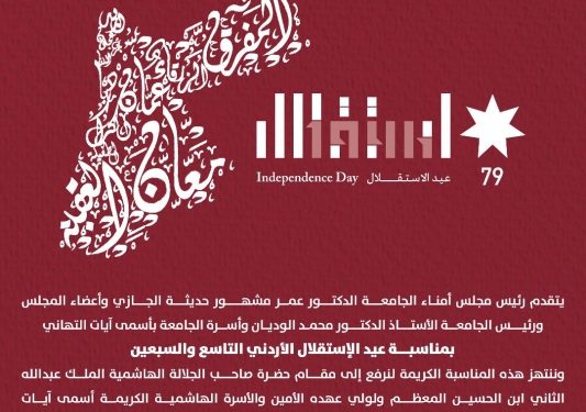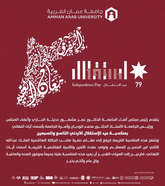 يتقدم رئيس مجلس أمنـاء الجامعـــة الدكتـــور عمــر مشهــــور حديثـــة الجـــازي وأعضاء المجلس ورئيـــس الجامعــة الأستـــاذ الدكتـــور محمـد الوديـان وأســرة الجامعة بأسمى آيات التهاني