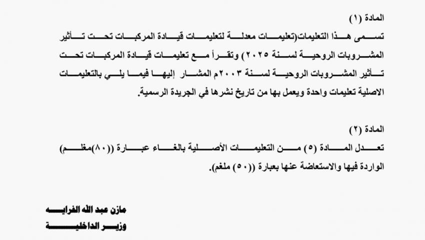 صدرت في عدد الجريدة الرسمية اليوم الاحد، تعليمات معدلة لتعليمات قيادة المركبات تحت تأثير المشروبات الروحية لسنة 2025. وجاء في التعليمات الجديد: تعدل المادة 5 من التعليمات الأصلية بالغاء عبارة 80 ملغم الواردة فيها والاستعاضة عنها بعبارة 50 ملغم.