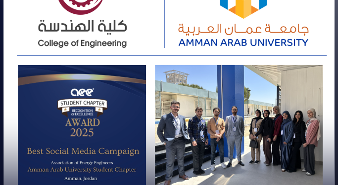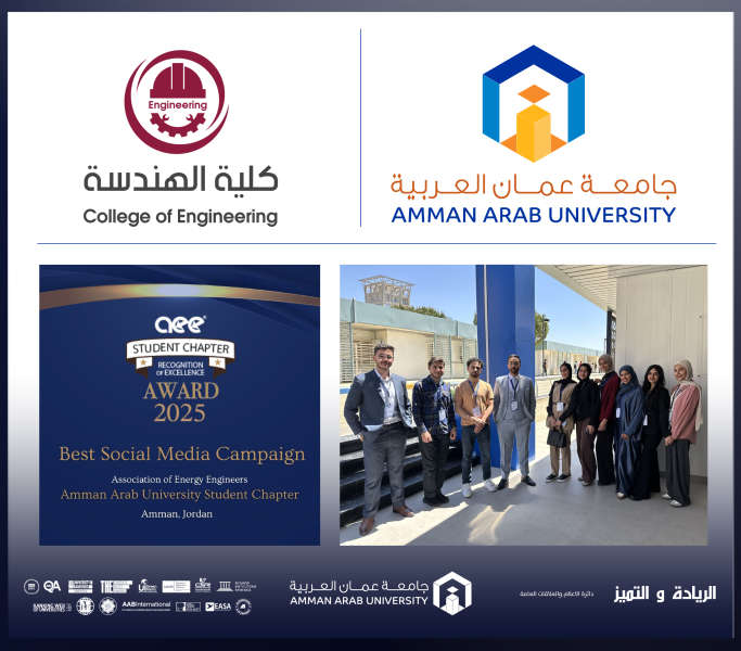 في إنجاز دولي جديد يعكس تميز طلبة جامعة عمان العربية وروحهم الإبداعية، فاز الفرع الطلابي لجمعية مهندسي الطاقة (AEE) في الجامعة بجائزة “أفضل حملة على وسائل التواصل الاجتماعي – Best Social Media Campaign”، ضمن الجوائز السنوية التي تمنحها الجمعية لأكثر الفروع الطلابية تأثيراً حول العالم، وجاء هذا الفوز تحت إشراف الدكتور أكرم موسى، مستشار الفرع وعضو هيئة التدريس في كلية الهندسة، وبدعم مباشر من عميد الكلية الدكتور أنو العساف، الذي يحرص على دعم مشاركة الطلبة في الفعاليات الدولية وتعزيز حضورهم العالمي.