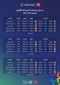 أصدر الاتحاد الأردني لكرة القدم جدول مباريات الجولات الخمس الأولى من بطولة الدوري الأردني للمحترفين CFI لموسم 2025/2026، والتي تنطلق يوم الخميس 31 تموز الجاري. وأوضح الاتحاد أنه أجّل إعلان مواعيد وملاعب باقي جولات مرحلة الذهاب إلى حين اتضاح مشاركة الأندية الأردنية قارياً في بطولة دوري أبطال آسيا 2، بانتظار سحب القرعة المقررة في 18 آب المقبل. مباريات الجولة الأولى الخميس 31 تموز: البقعة × السرحان – الساعة 6:00 مساءً – ملعب البترا. السلط × شباب الأردن – الساعة 8:45 مساءً – ستاد عمان الدولي. الجمعة 1 آب: الحسين × الأهلي – الساعة 6:00 مساءً – ستاد الحسن. الوحدات × الرمثا – الساعة 8:45 مساءً – ستاد الملك عبدالله الثاني. السبت 2 آب: الفيصلي × الجزيرة – الساعة 7:30 مساءً – ستاد عمان الدولي. موسم استثنائي وتطوير المسابقات ويشارك في البطولة 10 أندية ضمن موسم استثنائي يطبّق فيه الاتحاد الأردني استراتيجية جديدة لتطوير المسابقات وتحديث البطولات، حيث تُقام المنافسات بنظام الدوري المجزأ من ثلاث مراحل، ويتوج باللقب الفريق الذي يحصد أكبر عدد من النقاط مع ختام المراحل الثلاث، فيما يهبط آخر فريقين إلى دوري الدرجة الأولى.