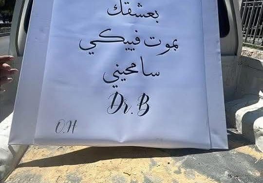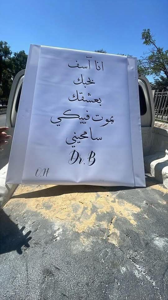 أثارت رسالة اعتذار غرامية، كتبها أحد الأردنيين عبر يافطة علقت في إشارة مرورية بمنطقة عمان، فضول المارة والمواطنين على حد سواء. وكتب في الرسالة: “أنا آسف، بحبك، بعشقك، بموت فيكي، سامحيني”، موجهة إلى فتاة رمُز لها بـ “Dr.B”، فيما وقع صاحب الرسالة برمز “O.H”.