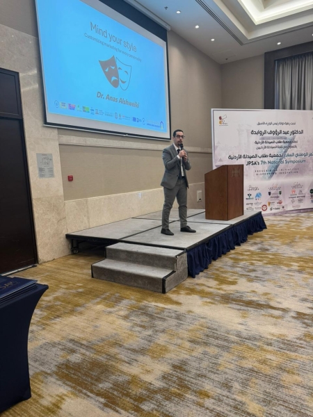 في إطار سعي كلية الصيدلة في جامعة عمان العربية إلى تعزيز حضورها الأكاديمي وإيمانًا بأن التواصل الفعّال يمثل حجر الأساس في نجاح الصيدلاني، وأن امتلاك مهارات التعامل مع الآخرين لا تقل أهمية عن المعرفة العلمية، شارك الدكتور أنس الشويكي عضو هيئة التدريس في كلية الصيدلة في المنتدى السنوي السابع لاتحاد طلبة الصيدلة الأردنيين (JPSA) الذي انعقد في فندق الموفنبيك/الأردن.