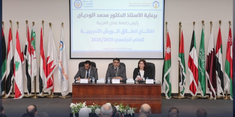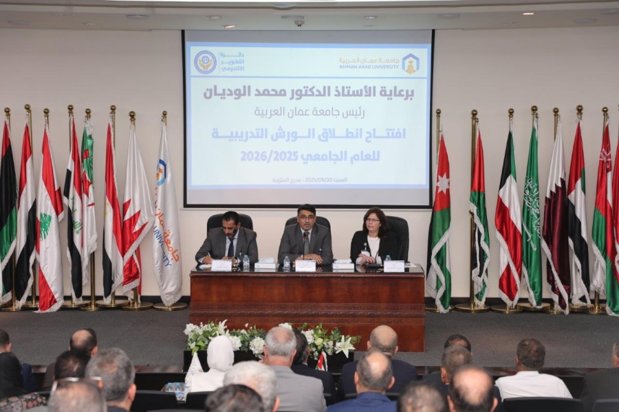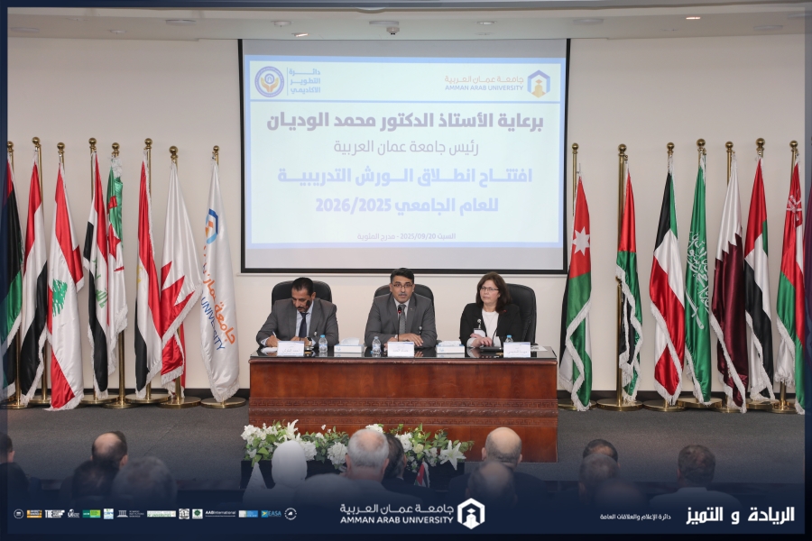 في إطار سعي جامعة عمان العربية نحو تطوير الكفاءات التعليمية وتحديث أساليب التدريس بما يتناسب مع التطورات الحديثة في مجال التعليم العالي، افتتح الأستاذ الدكتور حسام الحمد نائب الرئيس للتخطيط وضمان الجودة، مندوباً عن الأستاذ الدكتور محمد الوديان رئيس الجامعة أعمال الورش التدريبية لأعضاء الهيئة التدريسية ضمن برنامج خطة التطوير الأكاديمي للعام الجامعي 2025/2026 والتي ينفذها مركز التطوير الأكاديمي وضمان الجودة / دائرة التطوير الأكاديمي.