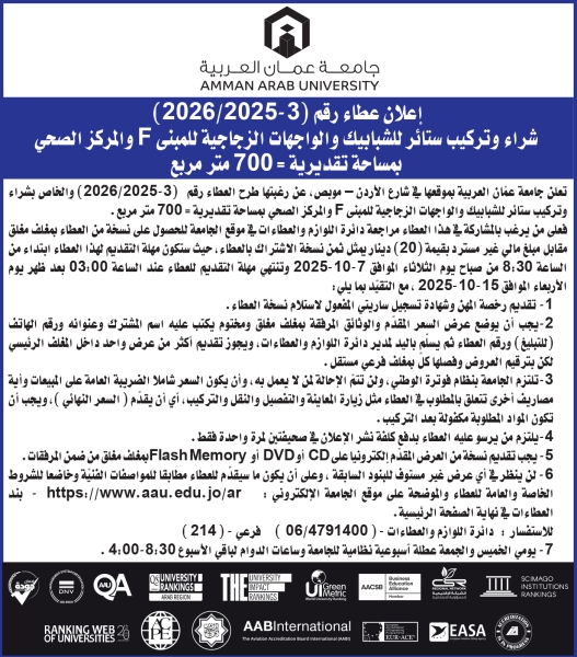 تعلن جامعة عمان العربية عن رغبتها بطرح عطاء رقم (3 – 2025/2026) شراء وتركيب ستائر للشبابيك والواجهات الزجاجية للمبنى F والمركز الصحي