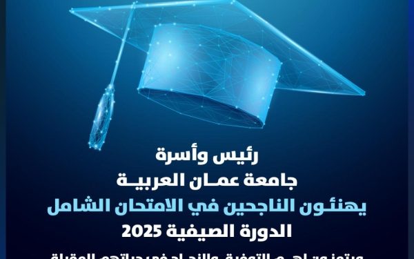 رئيس وأسرة جامعة عمــان العربيــة يهنئـون الناجحين في الامتحان الشامل الدورة الصيفية 2025 ويتمنـون لهـــم التوفيق والنجــاح في حياتهم المقبلة