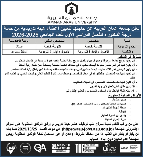 تعلن جامعة عمان العربية عن حاجتها لتعيين أعضاء هيئة تدريسية من حملة درجة الدكتوراه للفصل الدراسي الأول للعام الجامعي 2025-2026