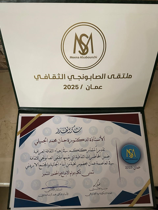 وفي ختام الفعالية كرّم ملتقى الصابونجي الثقافي الدكتورة حنان الجميلي تقديراً لمساهمتها العلمية ودورها في إثراء المشهد الثقافي والمعرفي في المجتمع الأردني.
