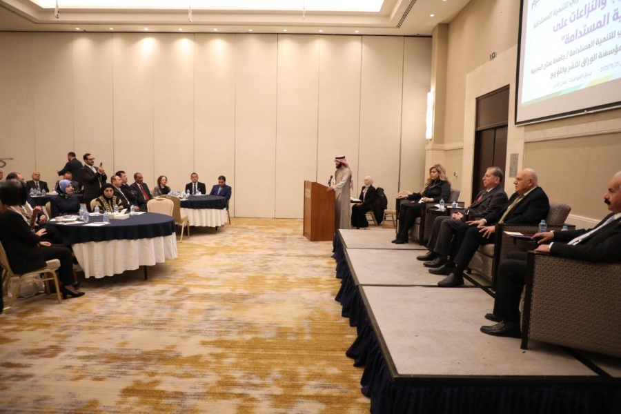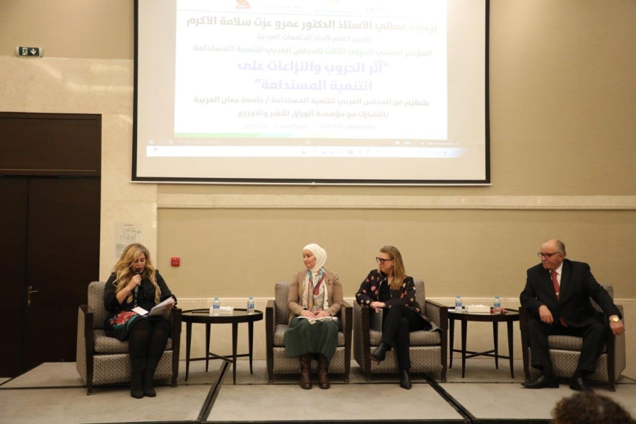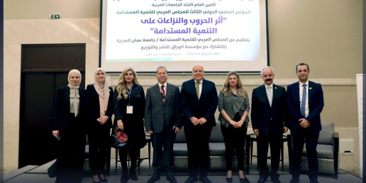 تحت رعاية معالي الأستاذ الدكتور عمرو عزت سلامة الأمين العام لاتحاد الجامعات العربية عقدت جامعة عمان العربية فعاليات المؤتمر العلمي الدولي الثالث للمجلس العربي للتنمية المستدامة في جامعة عمان العربية بعنوان “أثر الحروب والنزاعات على التنمية المستدامة”، بالتشارك مع مؤسسة الوراق للنشر والتوزيع وبحضور كلّ من : الأستاذ الدكتور محمد الوديان رئيس جامعة عمان العربية ورئيس المؤتمر ، والدكتورة شيرين أبو غزالة المنسق العام ومدير المجلس العربي للتنمية المستدامة ، والأستاذ الدكتور حسن الزعبي رئيس اللجنة التحضيرية ، ونائب ومساعدي رئيس الجامعة وعمداء الكليات وأعضاء الهيئتين التدريسية والإدارية ، وبمشاركة نخبة من الخبراء والأكاديميين والباحثين من مختلف الدول العربية والدولية من بينهم ثلاثة متحدثين رئيسيين دوليين، والذي عُقد في فندق الموفينبيك – عمان .