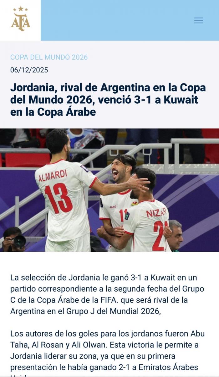 أبرز الاتحاد الأرجنتيني لكرة القدم عبر موقعه الإلكتروني فوز المنتخب الأردني على الكويت بنتيجة 3-1 في كأس العرب، مشيرًا إلى أن النشامى – الذين سيواجهون الأرجنتين في المجموعة العاشرة لكأس العالم 2026 – يواصلون تقديم عروض قوية لافتة.