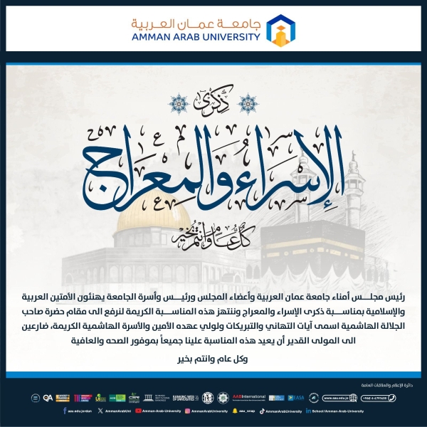 الدكتور عمر مشهور الجازي رئيس مجلس أمناء جامعة عمان العربية وأعضـاء المجلـس والأستاذ الدكتور محمد الوديان رئيـس الجامعة وأسـرة الجامعـة يهنئـون الأمّتيــن العربيــة والإسلاميــة بمناسبة ذكرى الإسراء والمعراج وننتهز هذه المناسبة الكريمة لنرفع الى مقام حضرة صاحب الجلالة الهاشمية الملك عبدالله الثاني ابن الحسين اسمى آيات التهاني والتبريكات ولولي عهده الأمين والأسرة الهاشمية الكريمة، ضارعين الى المولى القدير أن يعيد هذه المناسبة علينا جميعاً بموفور الصحه والعافية