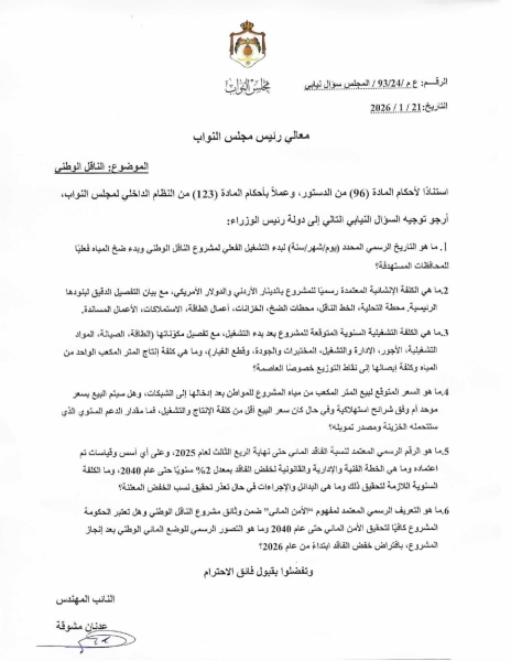 كما استفسر عن الكلفة التشغيلية السنوية المتوقعة بعد بدء التشغيل، وتفصيل مكوناتها، إلى جانب كلفة إنتاج المتر المكعب من المياه وكلفة إيصالها إلى نقاط التوزيع، خصوصًا العاصمة عمّان.