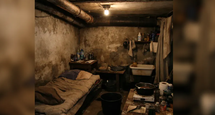 ووصفت الشرطة القبو الذي كان يسكنه بأنه “غرفة بلا نوافذ، تفتقر إلى مرافق الاستحمام وإلى دورة مياه، وحتى إلى مستلزمات إعداد الطعام”.