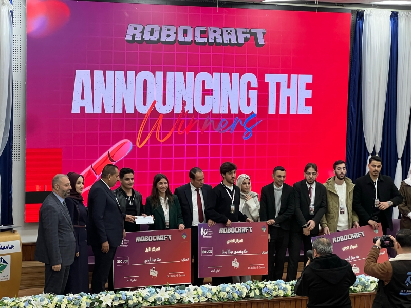 في إطار مسيرة جامعة عمان العربية المتواصلة نحو الريادة الأكاديمية والابتكار التقني، وفي إنجاز نوعي جديد يضاف إلى سجل التميز الأكاديمي للجامعة، حقق طلبة جامعة عمان العربية إنجازًا بارزًا وذلك ضمن مشاركتهم في مسابقة (RoboCraft) التي نظّمها فرع IEEE Robotics and Automation Society (RAS) في جامعة جدارا وبمشاركة واسعة من الجامعات الأردنية، حيث تُوّجت جهود الطلبة بتأهل فريقين من فرع (IEEE) ضمن طلبة كلية تكنولوجيا المعلومات في الجامعة إلى نهائيات المسابقة.