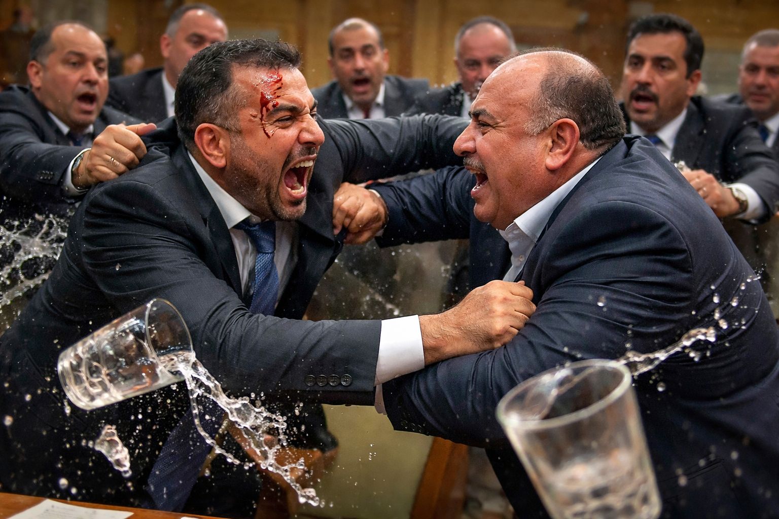 إلا أن حدة النقاش تصاعدت وثارت فجأة بين النائب أيمن البدادوة، والنائب السابق خالد الفناطسة، ووصلت الأمور إلى ذروتها بعد هذ الكلمة ” القانون راح يتم التصويت عليه غصب عنكم ” كانت بمثابة الشرارة التي قيلت بلهجة حادة أشعلت الأجواء، حيث ارتفعت الأصوات وتحول الجدال إلى تدافع بالأيدي وتراشق بأكواب الماء التي كانت على الطاولات. وخلال حالة الفوضى، تعرض النائب البدادوة لخدش بسيط في الجبين أدى إلى نزيف خفيف، قبل أن يتدخل الحضور بسرعة لفض الاشتباك وتهدئة الموقف.