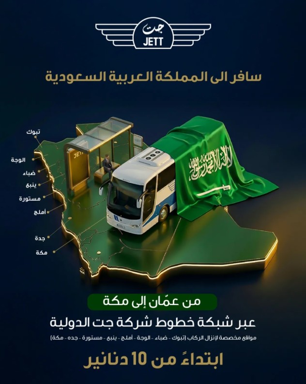 أعلنت شركة جت ، عن تنظيم رحلات برية من عمّان إلى مكة مع خطوط جت الدولية / وكلاء شركة سات ( سابتكو ) في السعودية.