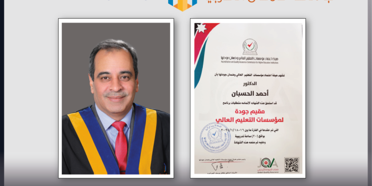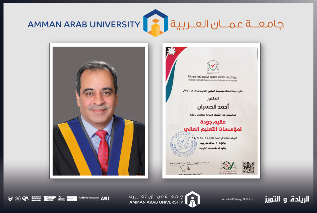 حصل الدكتور احمد الحسبان مدير مركز التطوير الأكاديمي وضمان الجودة وعضو هيئة التدريس في كلية علوم الطيران في جامعة عمان العربية على شهادة مقيم جودة معتمد لمؤسسات التعليم العالي وذلك بعد حضوره 20 ساعة تدريبية ضمن برنامج مقيم جودة معتمد والتي عقدت في مقر هيئة اعتماد مؤسسات التعليم العالي وضمان جودتها، حيث تهدف هذه الدورة التدريبية إلى إعداد وتأهيل المشاركين حتى يكونوا مقيمي جودة على المستوى المؤسسي والبرامجي ومؤهلين للعمل في إدارات جودة التعليم العالي في مؤسسات التعليم العالي.