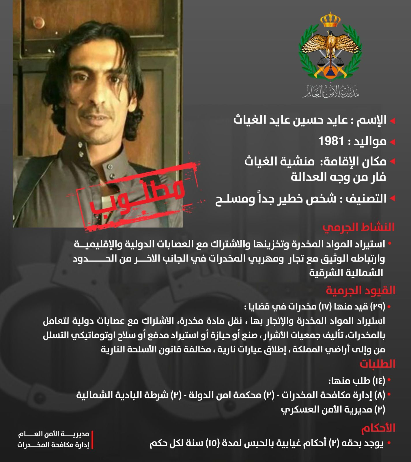 مسجل بحقه (8) قيود امنية في قضايا: استيراد المواد المخدرة والاتجار بها ، مخالفة قانون الأسلحة النارية.